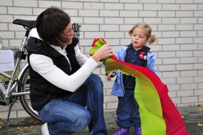 Emely bastelt derweil schon mal mit Mama eine Papierrose. Zum Schmücken des Wagens werden einige benötigt. So interessiert wie sie zusieht gibt es nächstes Jahr eine Bastlerin mehr an der Papierrosenfront.