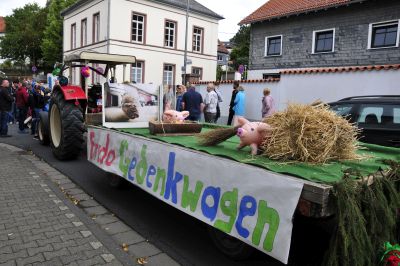 Reinhold Hieß hat Nina als Unterstützung auf dem Erntewagen! Ja, super, ich dachte schon es wird in diesem Jahr wohl keinen geben. Die Kerbegesellschaft hat ihn zusammen mit Reinhold gestaltet.Von ihm kam sozusagen die Grundausstattung und für Früchte und Gemüse sorgten die Kerbemädcher.Das finden bestimmt alle Wingsbacher cool.