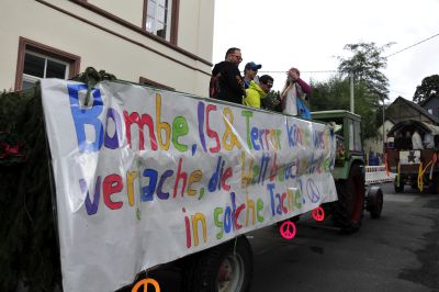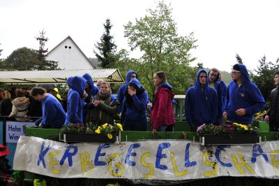 An der Halle angekommen dreht der Regen noch mal voll auf. Fragender Bilck zu Jana Petri? “Der Kerbespruch wird draußen vorgetragen”, entscheidet die Präsidentin. Da müsst ihr jetzt durch. Ein Lob an die Kerbespruchschreiber- und Gestalter. Sehr gute Arbeit! Das durchgeweichte Publikum harrte brav vor der Halle aus und las trotz klammer Finger eifrig mit. Alle wurden bedacht, was viele Lacher bestätigten.