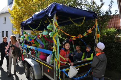 Der Zug ist kurz vor der Halle. Doch wird er sich noch den Berg hinauf winden. Im Kirchforst dreht er noch eine Runde, bevor alle Wagen in der Nähe der Halle angelangt sind. Die Zuschauer wanderten mit. “Achtung! Kleingeld parat halten!” Der Kerbespruch ist schnell vergriffen, zumal er in diesem Jahr einen goldigen Einband hat.