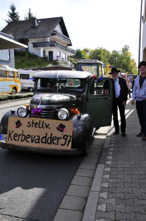 “Vergiss die Steckeröther nicht”, rief mir Jana noch zu, als ich mit der Kamera weiter eilte. Hier also die Kerbegesellschaft Steckenroth. Und neben an, “a very old Auto!” Na, ja 1997 ist auch schon ein paar Tage her. Sigi Cimadom lenkte es.Steffen Schmidt ist stellvertretender Kerbevadder für´97. |