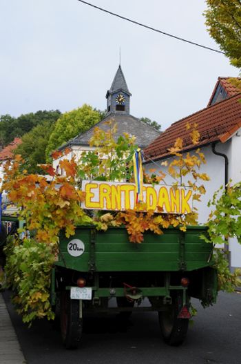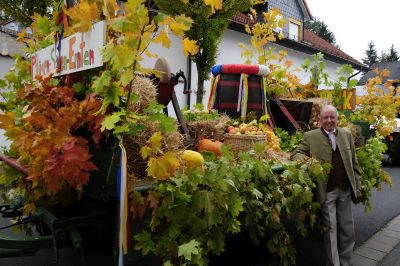 Der Ernte Wagen von und mit Reinhold Hieß, wie immer umwerfend bunt und frisch! Frisch, ist das Stichwort und ich weiß auch wieso das ganze Laub wie eben vom Baum geholt aussah. Reinhold stellte es extra ins Wasser! Einfach Spitze, so viel Einsatz in seinem Alter! Leider machte der Kurier ihn noch älter, aber da steht er sicher drüber.