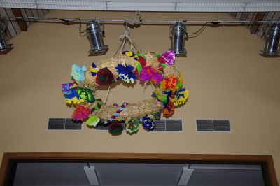 Der Erntekranz leuchtet bunt an seinem Platz und lässt den Regen erst mal vergessen.