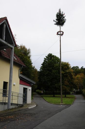 Der Kerbebaum, er steht schon seit Donnerstag an seinem besonderen Platz neben der Halle, dem Feiertag sei Dank.
