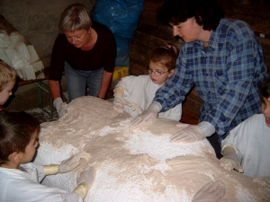 Hier gibt S. Müller noch mal kurze Anweisungen, wie alles gemacht wird. Die kleinen Bäcker sind ganz Ohr.