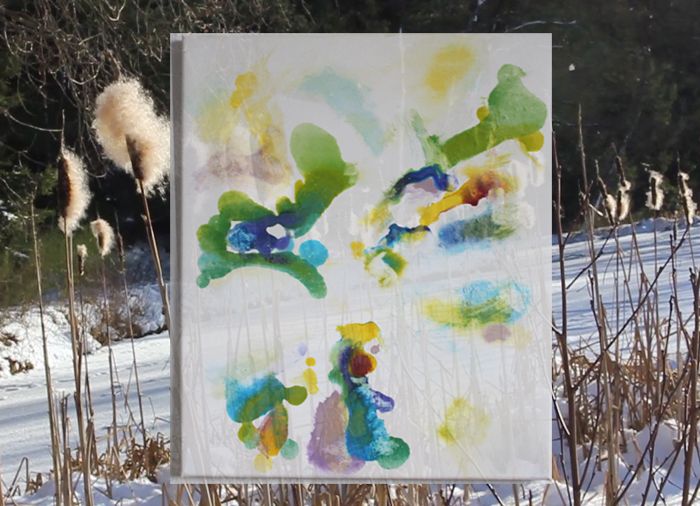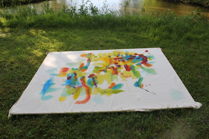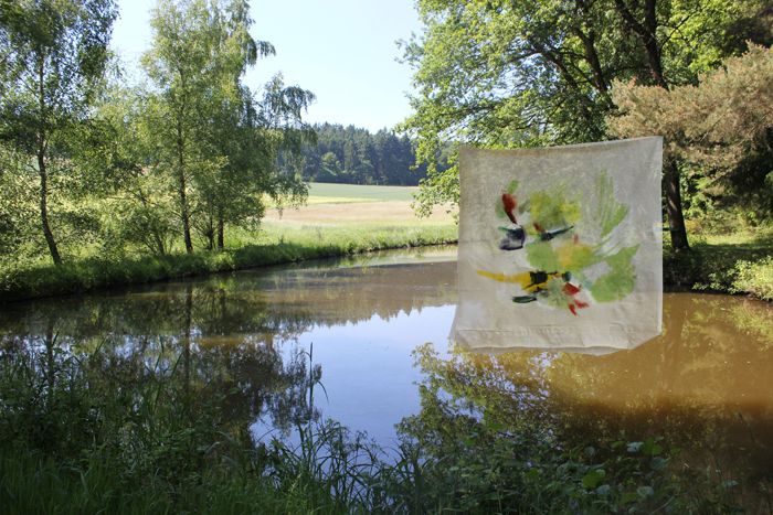 Wenn ich unterwegs an Orten male, aquarelliere ich oft, weil Aquarellfarben und Papier gut zu transportieren sind. Auf unserem Waldgrundstück kann ich experimentieren. Deshalb sind hier viele große Formate mit Ölfarben entstanden. In den letzten Jahren habe ich mit Öl auf Stoff (Nessel) gemalt, den ich auf Keilrahmen gespannt habe. Neu für mich ist es auch, den Stoff vor dem Bemalen in Falten zu legen oder zu rollen.