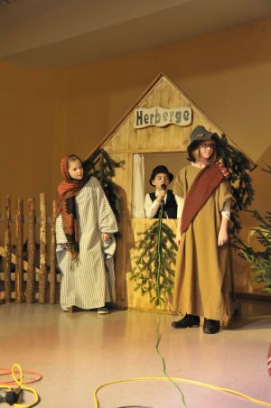 Der Wirt war zuerst nicht nett zu Maria und Josef:”Ich kann euch nicht retten habe keine freien Betten!” Als er erfährt,dass Maria schwanger ist lässt er sich erweichen. “Dort im Stall bei Ochs und Rind ist Platz genug für euer Kind!” Man sieht richtig, wie erleichtert Josef und Maria im Stall ankommen.