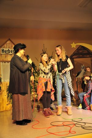 Doch dann:”Wer kommt denn noch, um diese Zeit?” Zwei Mädchen auf ihrer Geochaching Runde meinen genau bei Frau Schmitz etwas zu finden.Na, das ist ja lustig, die alte Frau versteht nichts von Handy und Geochaching. Die Kinder wissen wiederum nicht von wem Frau Sch. spricht, als sie Kaiser Augustus, König Herodes und den Wirt als Bösewichte bezeichnet.Die Kinder ziehen los und wollen etwas in den Kulissen finden.