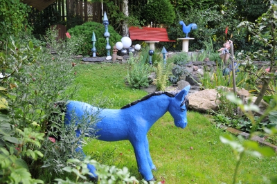Im romantisch gestalteten Garten des Kreativhofes befinden sich viele Kunstobjekte und lauschige Plätze zum Verweilen.