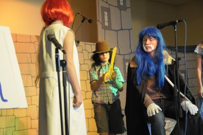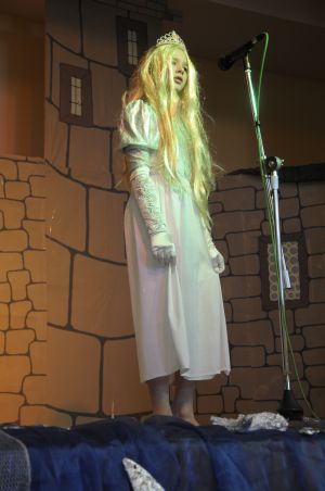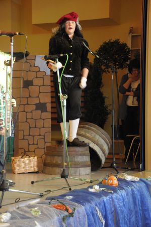 Doch plötzlich kann eine Harfe sprechen und wie ein Echo ruft sie: “ Der König hat lange Ooooohren, er hat ganz lange Löffelooooohren!” Jetzt ist das Geheimnis gelüftet. Alle wissen es. Wie peinlich für Donkeyking. Vor allen Untertanen wird er bloss gestellt! Doch seine Frau(Pia Schmitz)rettet ihn in dem sie ihre langen Ohren aus der Haarpracht hervor holt. Auch Aisling hilft.“ Papa du musst dich doch nicht schämen, schau Mama hat auch solche Ohren und alle haben sie lieb.” “ Ja, habt ihr mich mit solchen Ohren auch lieb?”, fragt er die Dorfbewohner. “ Ja, hoch lebe unser König“, rufen alle im Chor. “ Ja, lieber Mann, denn wahre Schönheit kommt von innen und Königliche Stärke bemisst man nicht an den Ohren”, sagt die Königin weise. Da muss Donkeyking eingestehen, dass er dickköpfig war, doch die Harfe hat ihm die Augen geöffnet. “Aber wieso kann eine Harfe sprechen?” fragt der König in die Menge. Paddy schiebt sich nach vorne: “ Ich glaube das ist meine Stimme. Als ich das Geheimnis in den Wald gerufen habe, muss es der Feenbaum gehört und gespeichert haben. Und diese Harfe wurde ja aus dem Holz dieses Baumes gebaut. Als dann auf der Harfe gespielt wurde hat sie das Geheimnis wieder frei gegeben. “ Ziemlich viel Zauberei”, meint der König. Als seine Tochter ihn nun bittet, lässt er sofort alle Frisöre frei. Hurra! Jawohl! Hoch lebe unser König Donkeyking!