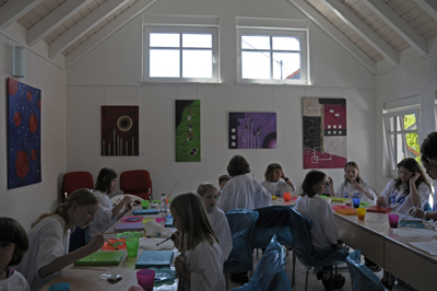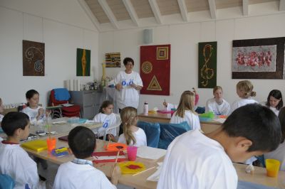 An den Wänden hängen A. Hanssens eigene Werke. Gute Anschauungsobjekte!? Nein, weit gefehlt, die kleinen Künstler sind sehr kreativ und mit Feuereifer bei der Sache. Sie gestalten ihre eigenen Vorstellungen .