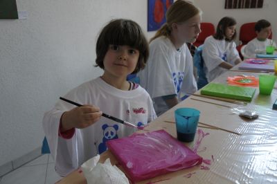 Jonas der jüngste Teilnehmer hat die erste Aufgabe schon bewältigt und den bespannten Rahmen mit schwarzer Farbe grundiert und beschliesst für sich , dass auch die Plastikdecke eine Massage mit Farbe gut gebrauchen kann. Ab und zu hört man Adrianas Zwischenruf: “ Denkt daran, die Farbe nicht mit Wasser mischen! “