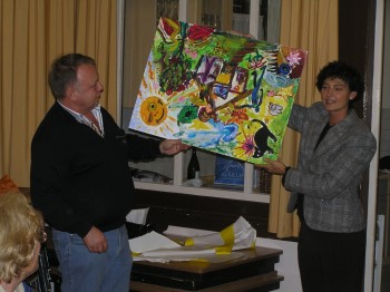 Die Familie Stoll bekam bei dieser Gelegenheit ein buntes Bild, einer Ko-Produktion der gesamten Künstlergruppe der Ausstellung, als Dankeschön dafür, dass sie ihre Räume für die 1. Ausstellung Wingsbacher Künstlerinnen und Künstler zu Verfügung gestellt hatte. Sie bedankte sich mit der Einladung, jederzeit gern wieder die Gelegenheit zu weiteren Ausstellungen in diesem bewährten Ambiente zu geben.